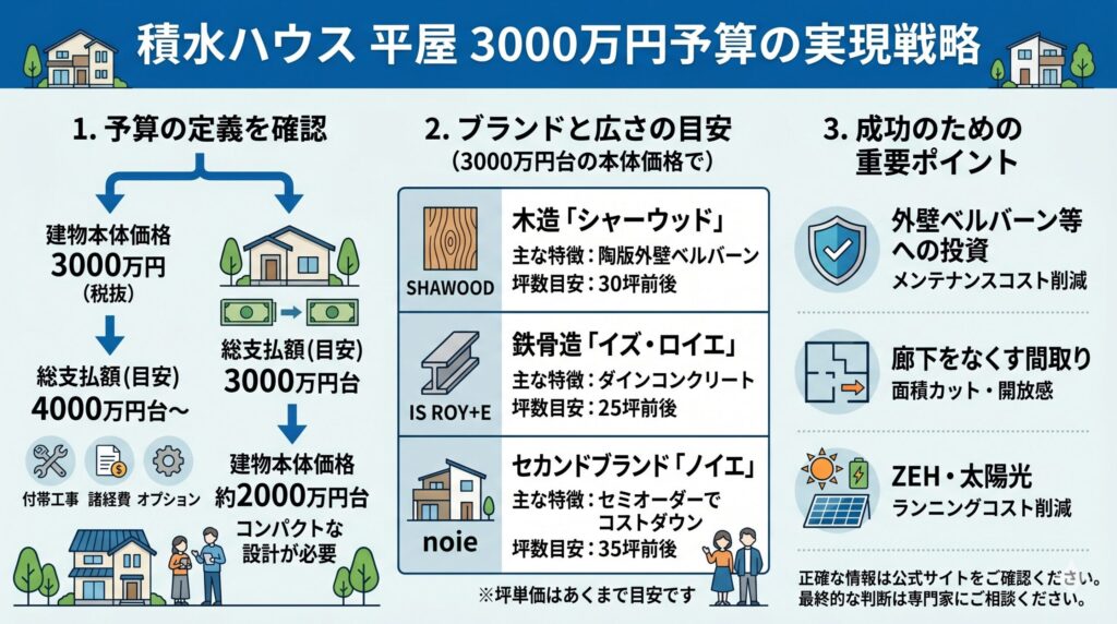 最後になりますが、積水ハウスの平屋を3000万という条件で検討する際のポイントを整理しましょう。