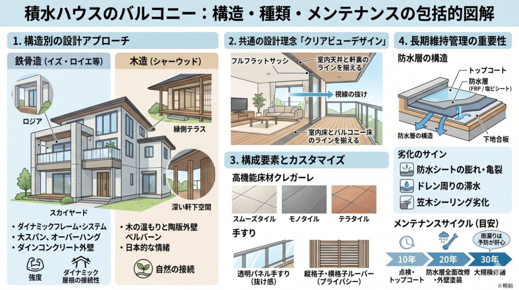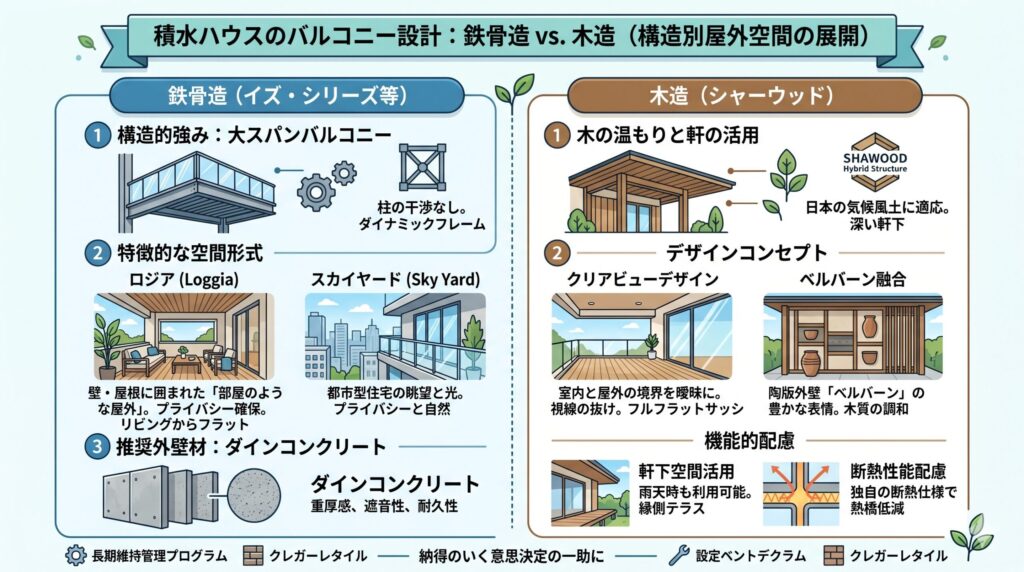 積水ハウスのバルコニーは、単なる「洗濯物干し場」ではなく、暮らしを豊かにする「中間領域」として設計されています。鉄骨造と木造、それぞれの構造の強みを活かした独自の空間づくりについて、詳しく見ていきましょう。
