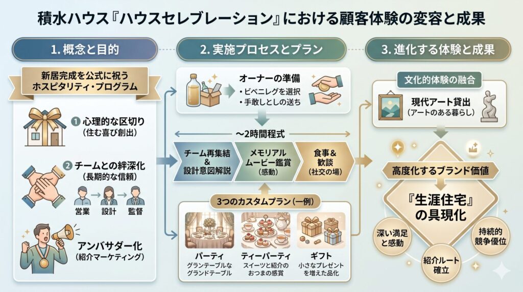 まとめとして、積水ハウスのハウスセレブレーションは単なる引き渡し後のパーティーではありません。それは、家づくりに関わった全ての人たちの想いを結集し、これから始まる長い生活のスタートを祝福する、極めて重要な「顧客関係管理」の場と言えます。
