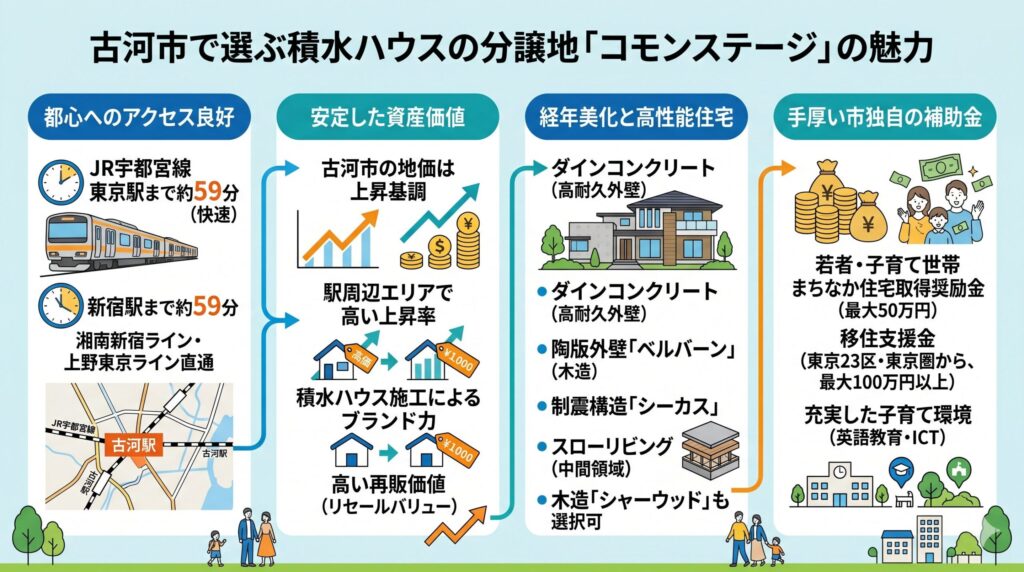 積水ハウスが展開する分譲地の中でも、古河市東本町1丁目の物件は別格の存在感があります。古河駅から徒歩6分という抜群の立地は、将来の資産性を考える上で大きなアドバイスになりますね。