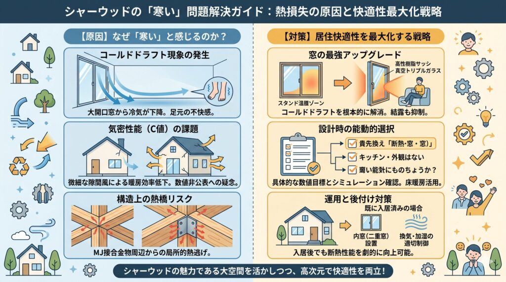 せっかくシャーウッドで建てるなら、絶対に快適な暮らしを手に入れたいですよね。ここでは、設計段階での工夫や入居後の運用で、寒さの不安を解消するための具体的なヒントをまとめました。