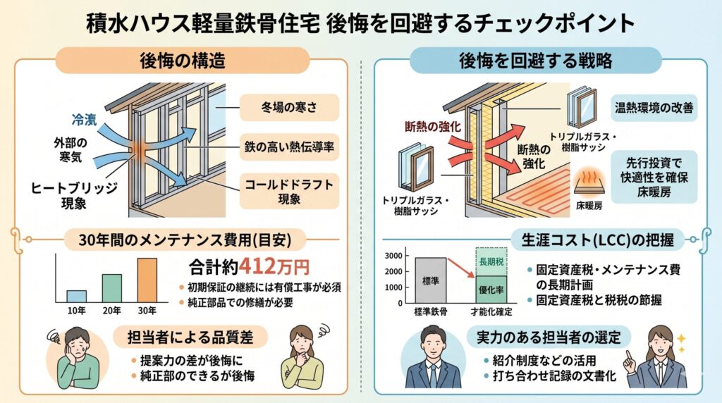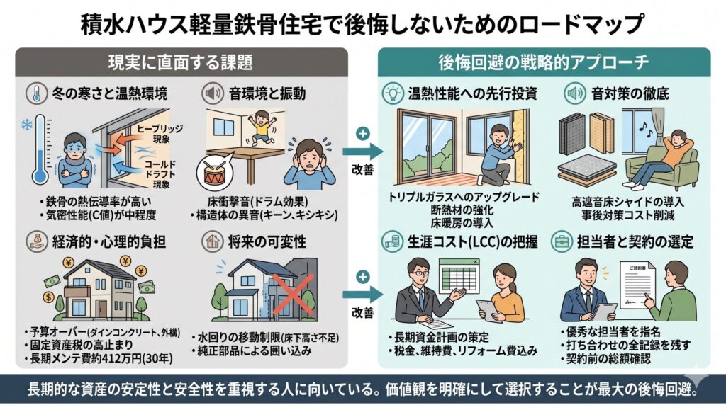 最後にまとめると、積水ハウスの軽量鉄骨住宅で後悔する人の多くは、ブランドのイメージに期待しすぎて、鉄骨特有の「寒さ」や「維持費の高さ」といった現実を十分に把握できていなかったケースが多いようです。